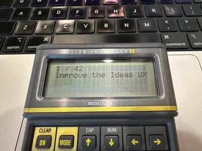 I woke up on day 19 of my December Adventure feeling that I’ve not used my Psions nearly enough in the past week: while I’ve been doing many Psion adjacent things with OpoLua and PsiEmu, I’ve not taken the time to sit down and tinker with the devices that inspire my adventuring and serve as enjoyably disconnected tools. With that in mind, I decided to tackle the first item in the Organiser II lucky dip and, ‘improve the Ideas UX’.