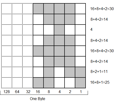Organiser II icons are 5px by 8px, and loaded as a sequence of 8 bytes using the UDG command. For example, the following character is written to user-defined character 1 with UDG 1,30,14,4,14,30,14,11,25.
