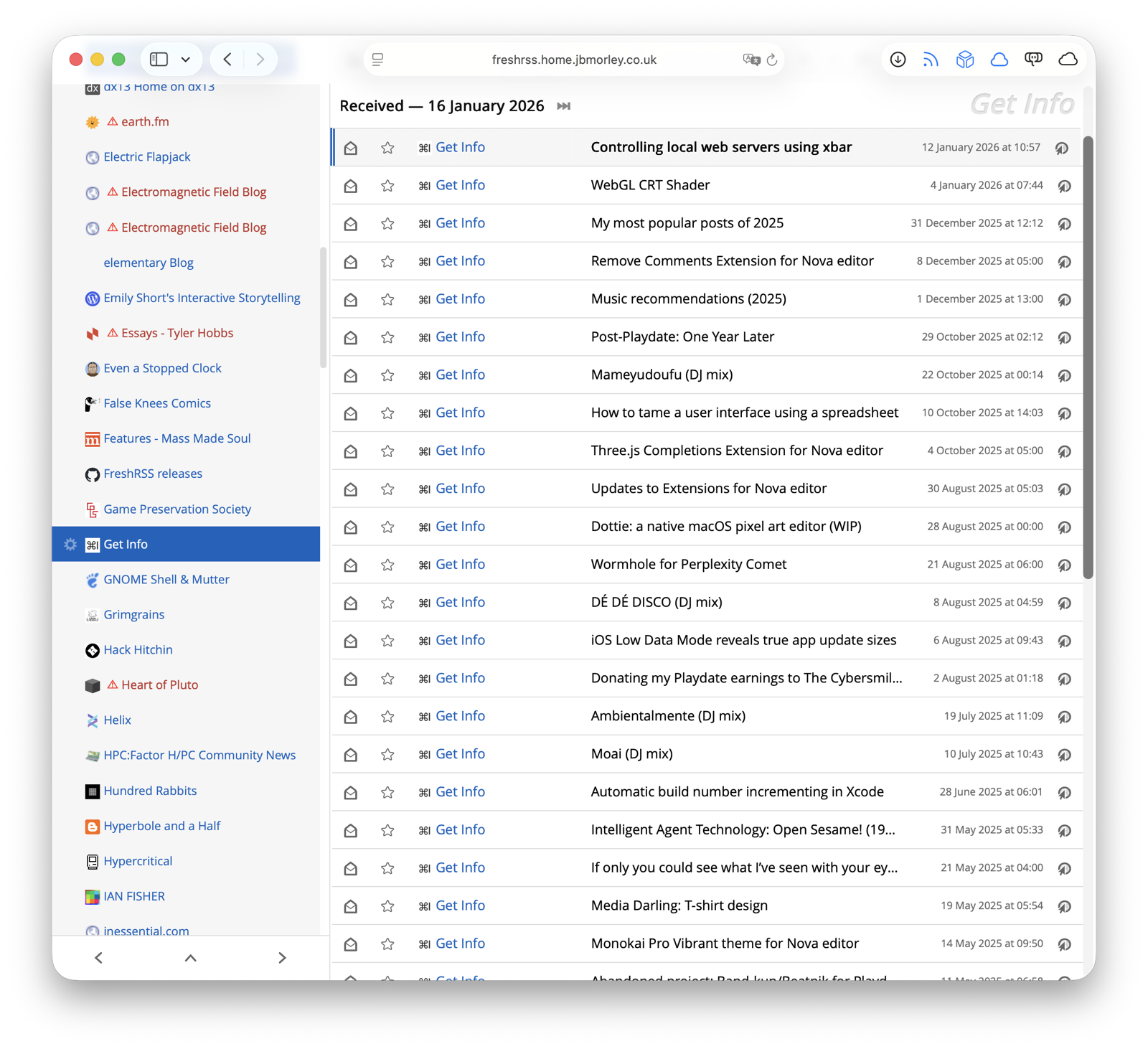 It’s nice to finally have a self-hosted feed reader again after nearly 20 years (though I still long for Shaun Inman’s Fever feed reader), and I’ve been pleasantly surprised to discover it’s well supported by client apps like NetNewsWire. I’m hopeful the switch will unlock syncing with various retro computers in the future.