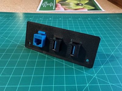 Since I only need to use two of the sleds, I decided to replace the other ones with custom keystone-compatible blanking plates to allow me to manage the ethernet and USB cabling within this single 1U of space, obviating the need for a separate patch panel. I designed the prerequisite part, printed, and fitted it.