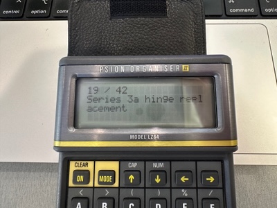 Having spent much of the past week of my December Adventure working on OpoLua, I decided it was time for a change. I again consulted the Organiser II lucky dip, which called for, ‘Series 3a hinge replacement’.