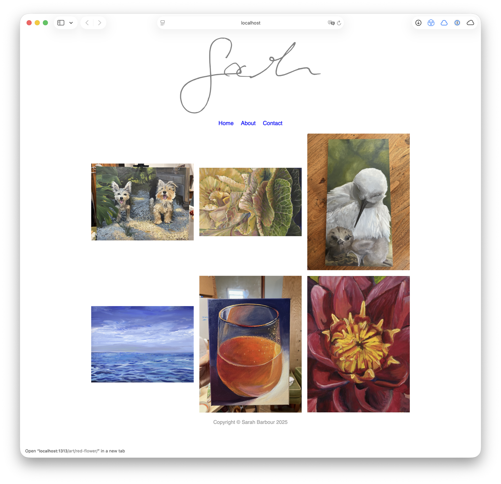In the afternoon, I took some time to work on a lightweight website to allow my partner Sarah to showcase her paintings. This gave me a nice excuse to spend a little more time with Hugo, which I last used to set up the Psion community website.