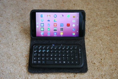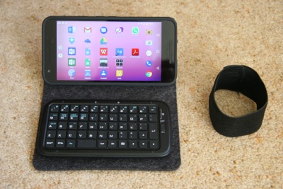 As a long-time user of mobile devices with keyboards (Psions, Nokia 9210, etc), my father is a relucant touch-only smartphone user. To help ease the path into the sadly-inevitable world of contemporary devices, I created a minimal felt case for his Nexus 5X that paired it with a little Bluetooth keyboard.